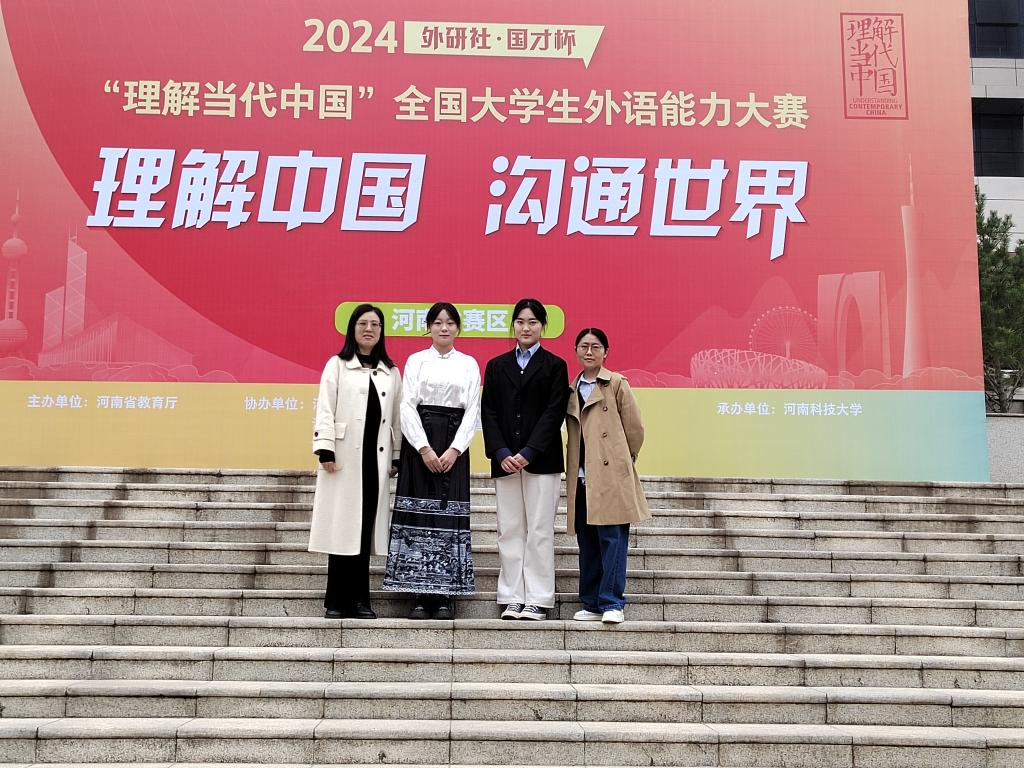 (尚爱华老师、訾晴老师带领演讲赛项的同学在河南科技大学参赛)
