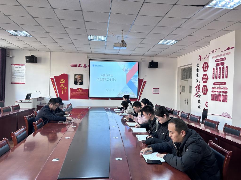 (文图/张一琪)10月29日,外国语学院在文华楼2-413会议室召开学生管理工作例会,全面部署近期学生工作重点任务。学院党委书记、副院长王晓龙,分团委书记刘星显及全体辅导员参会,会议由王晓龙书记主持。