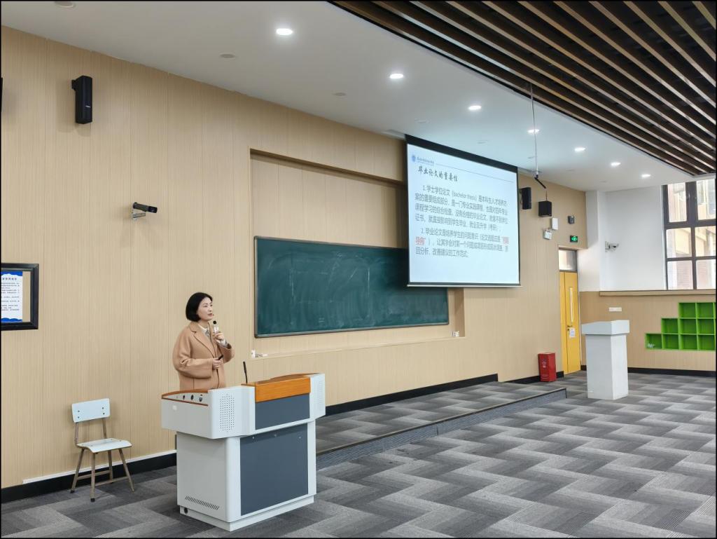 随后,主讲人赵梦帆老师围绕论文撰写的规范性要求展开了细致入微的讲解。她结合学院最新版指南,对论文的格式规范,如字体字号、行文间距、参考文献格式等进行了逐项说明,并辅以实例演示,使抽象的规定变得直观易懂。紧接着,赵老师又针对选题审批表的填写要点与常见问题进行了专项指导,明确了各项内容的填写规范与逻辑要求,梳理并强调了论文写作各阶段的时间节点与任务要求,为同学们顺利完成论文的第一步打下了坚实基础。