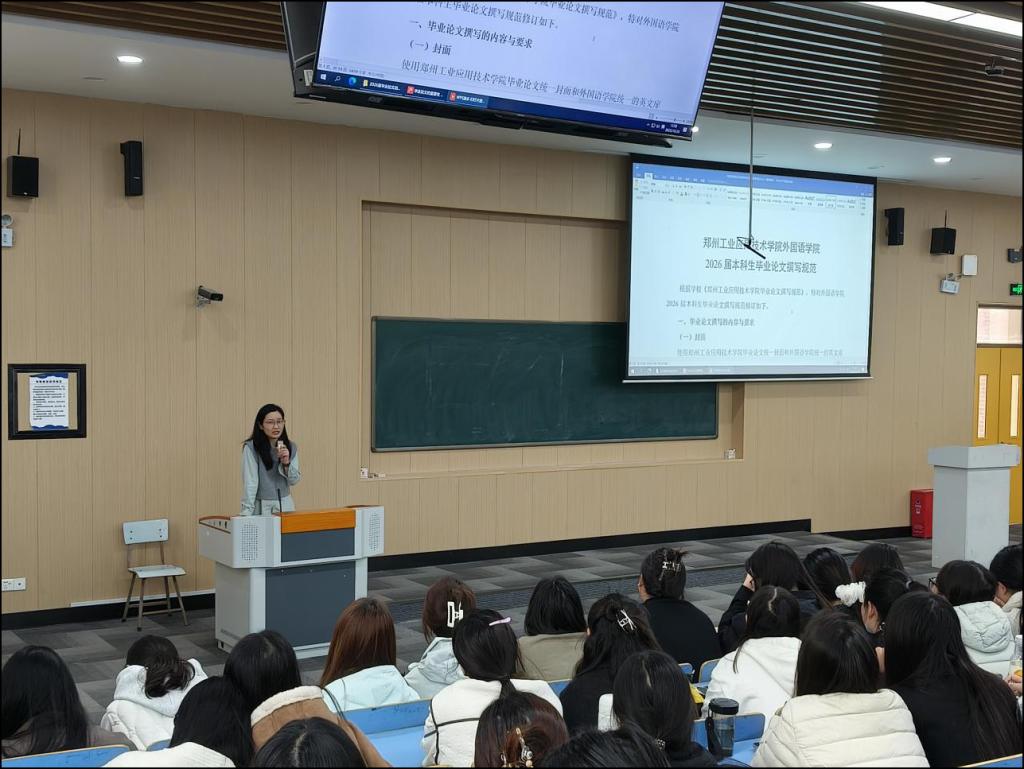 (文/陈曦 图/史宇轩)10月28日下午,外国语学院于文华楼阶梯四教室顺利举办毕业论文指导宣讲会。外国语学院院长孙丽娟、教师赵梦帆主讲,副院长张国昌主持,2026届全体本科毕业生参加。