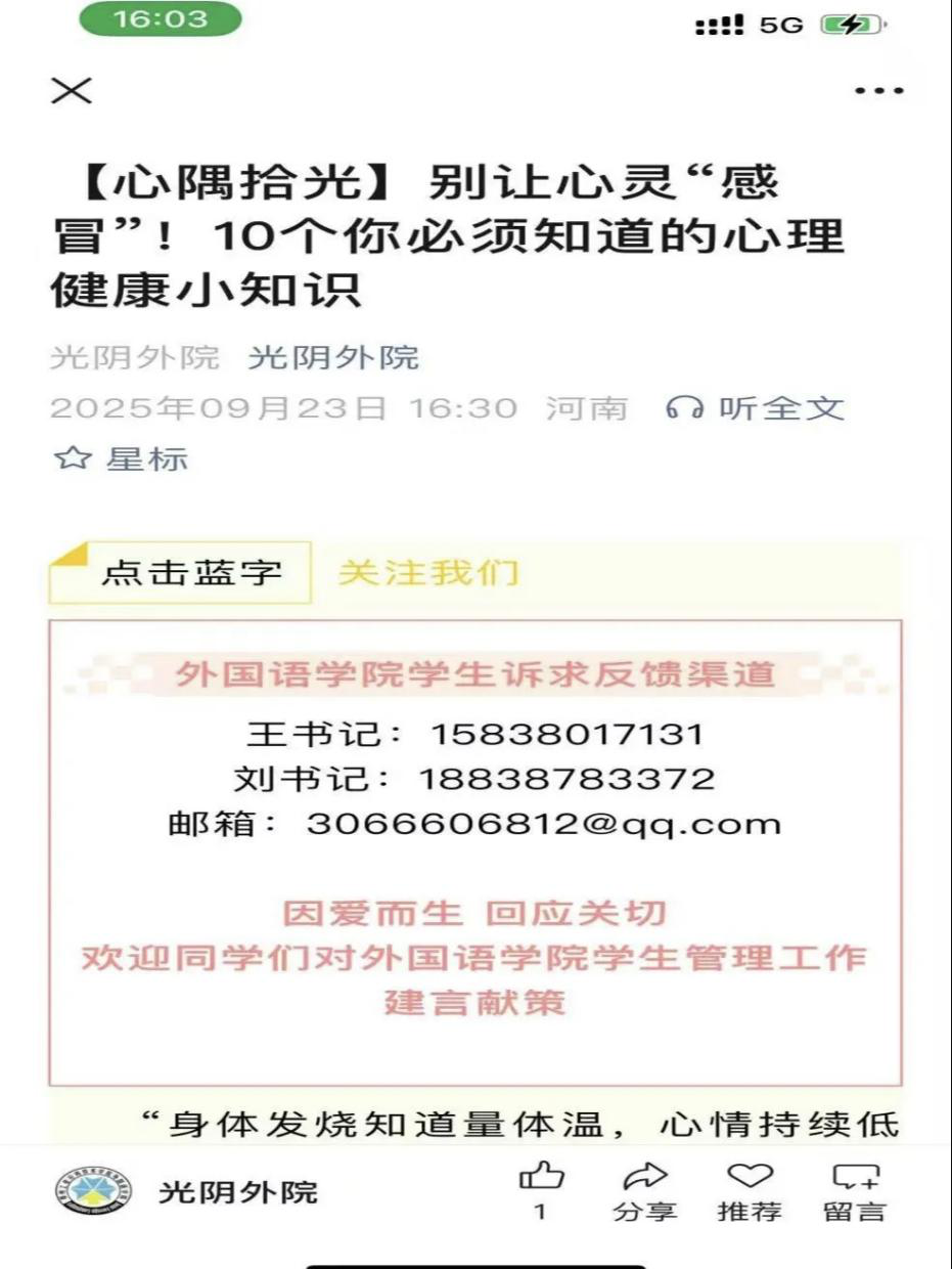 学院着力建设平台保障,打造“光阴外院”公众号特色专栏。该专栏开设心理知识科普、案例解析、活动预告与回顾等板块,定期推送专业心理健康知识,解读心理热点话题,分享学院心理活动动态,为学生提供便捷的心理知识获取渠道和互动交流平台,助力学生提升心理素养,营造积极健康的心理氛围,成为学院心理健康教育工作的重要宣传与服务窗口。