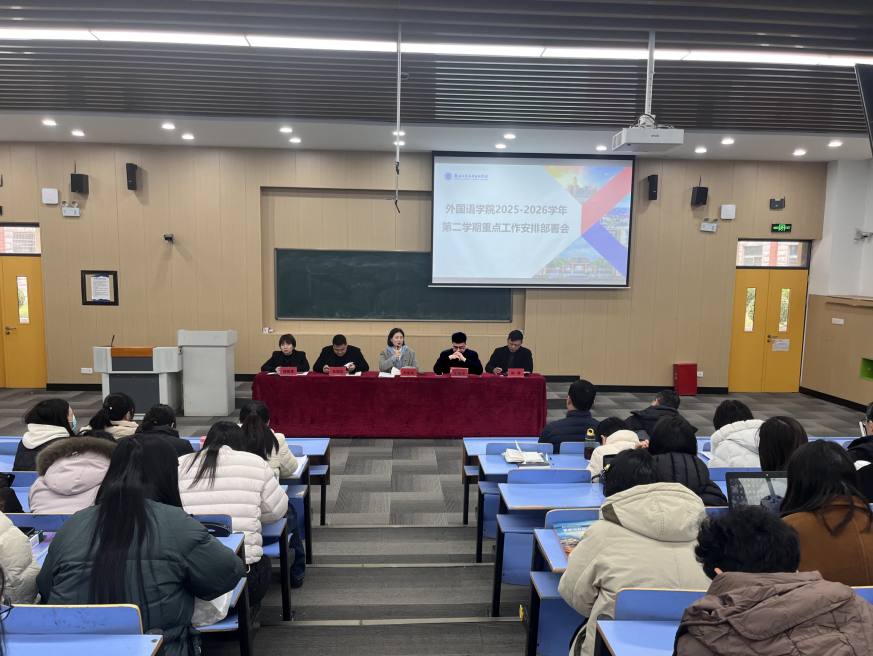 (文图/王冰洁)2026年3月6日下午,外国语学院在文华楼阶4大教室召开2025-2026学年第二学期重点工作安排部署会。会议由学院党政办公室主任郜丽果主持,学院领导班子成员分别就自己负责的工作作出安排,围绕新学期学生管理、教学科研、产教融合、学风建设等重点任务进行全面部署。全体教职工参加会议。