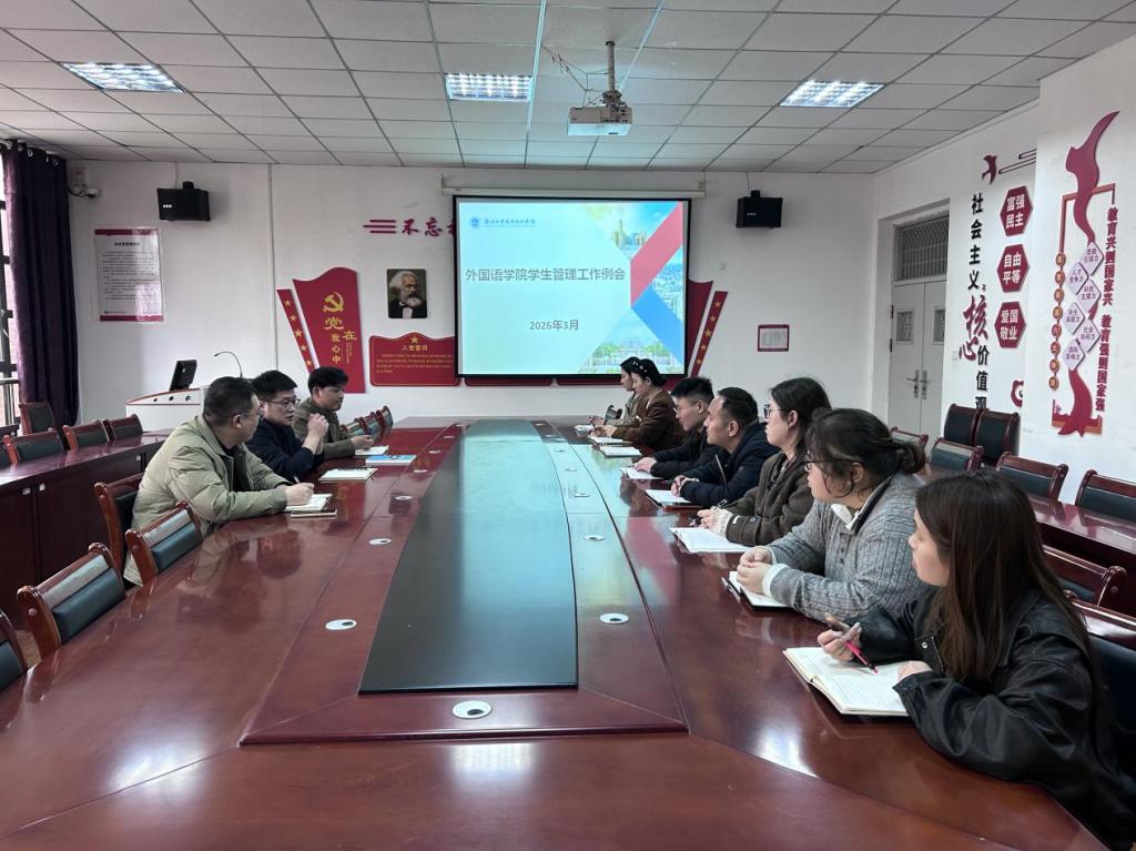(图文/张一琪)3月23日,外国语学院召开学生管理工作例会,学院党委书记、学生管理副院长王晓龙、分团委书记刘星显、全体辅导员参会,围绕近期学生管理重点工作部署安排,明确方向、细化分工。