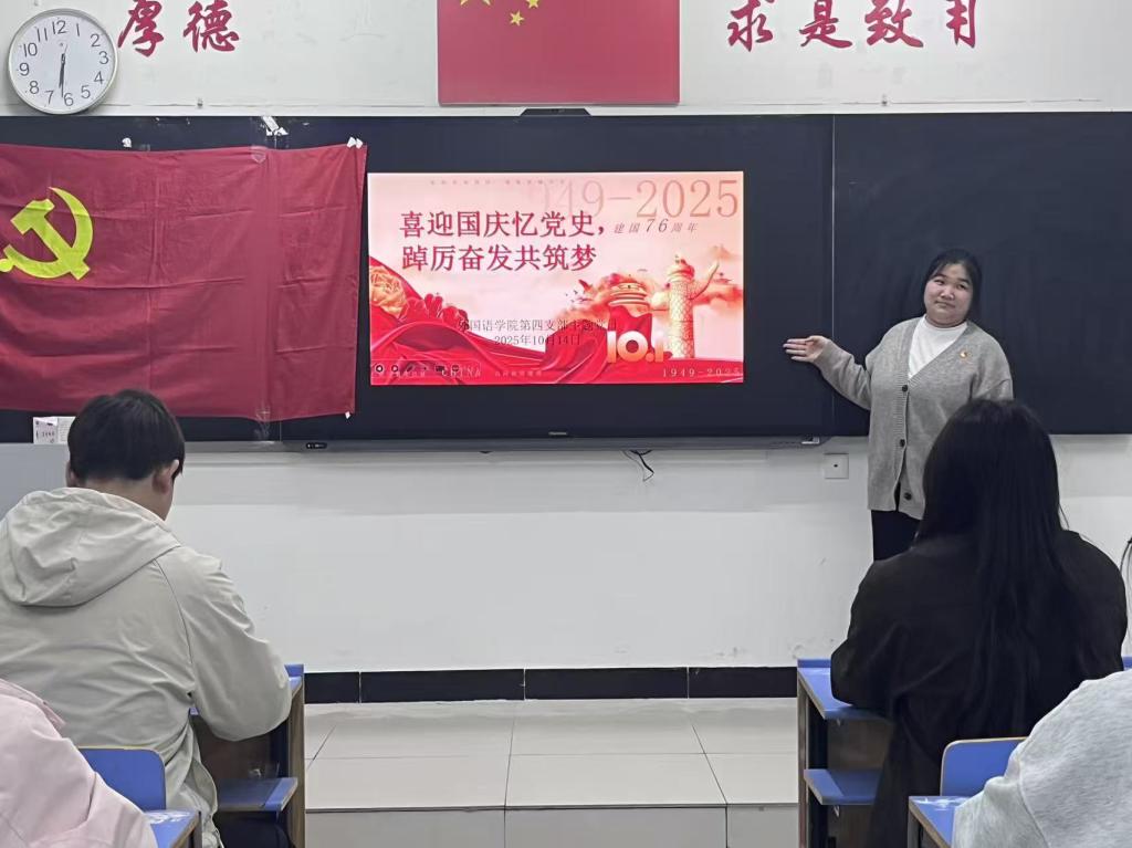 (文/吴彤 图/赵术云)为庆祝中华人民共和国成立76周年,深化学生党员对党史与国情的认知,将外语专业优势与红色精神传承深度融合,外国语学院学生第四党支部于10月14日18:30在文华2-216教室组织开展“喜迎国庆忆党史,踔厉奋发共筑梦”主题党日活动。本次活动由组织委员苏玉晴同志主持,支部全体党员同志参加。