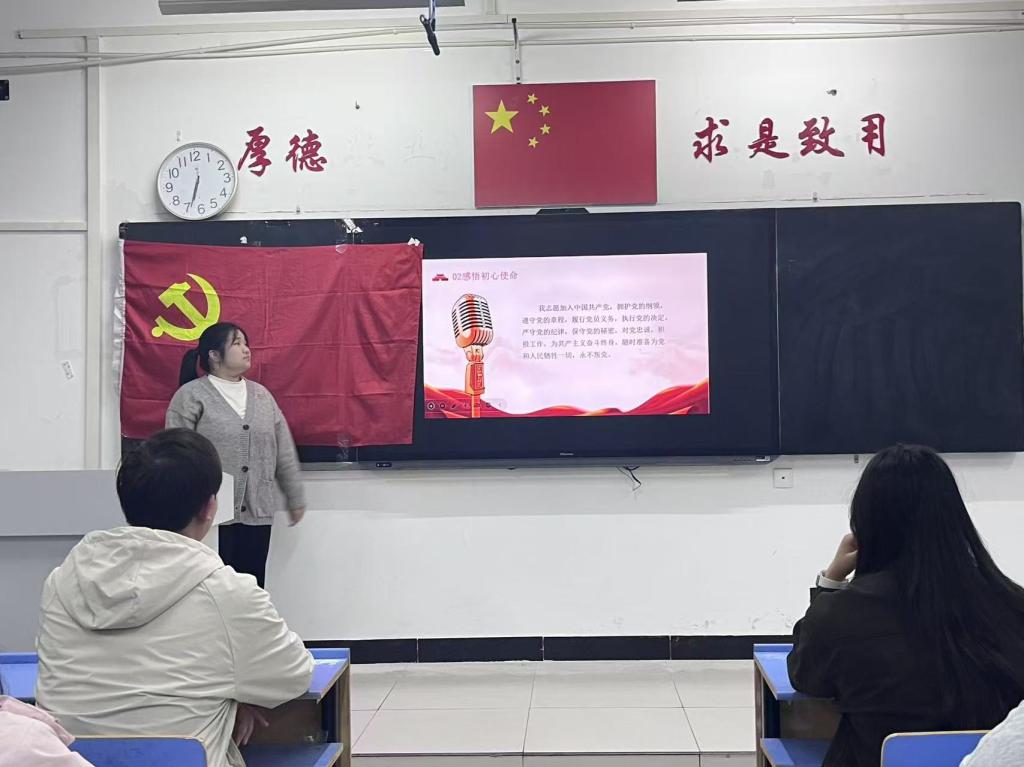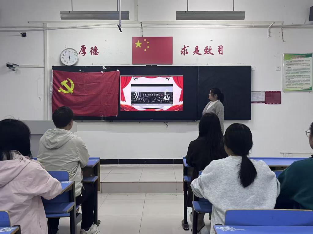 活动伊始,苏玉晴同志以“国庆与党史的精神共鸣”为切入点,结合新中国成立以来的外交历程,讲述外语工作者在党史关键节点中的故事,让在场党员深刻认识到“外语+红色信仰”的特殊意义。随后,苏玉晴同志通过播放抗战主题纪录片片段直观呈现了抗日战争的壮阔历程与民族精神,让在场党员沉浸式感受革命先辈的无畏担当。视频播放结束后,全体党员面向党旗肃立,重温入党誓词,强化党员的身份意识与责任意识,更让党史学习在庄重仪式感中筑牢信仰根基。最后,苏玉晴同志作总结:作为英语专业的学生,要从抗战历史与入党誓词中汲取力量,既要以专业能力讲好抗战故事、传播红色文化,更要以实际行动践行入党誓词,让红色基因在新时代外语人的青春征程中代代相传。