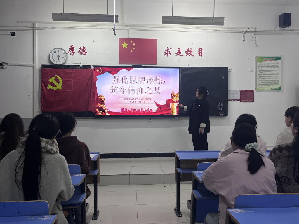 (文图/周泓妤)为引导青年党员在思想洗礼中坚定理想信念,夯实党性修养根基,外国语学院学生第四党支部于11月11日18:50在文华2-216组织开展了以“强化思想淬炼,筑牢信仰之基”为主题的党日活动。活动由支部组织委员苏玉晴同志主持,支部全体党员同志参与。