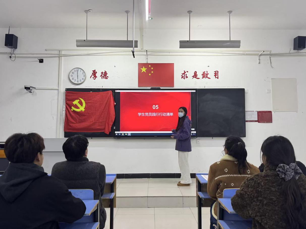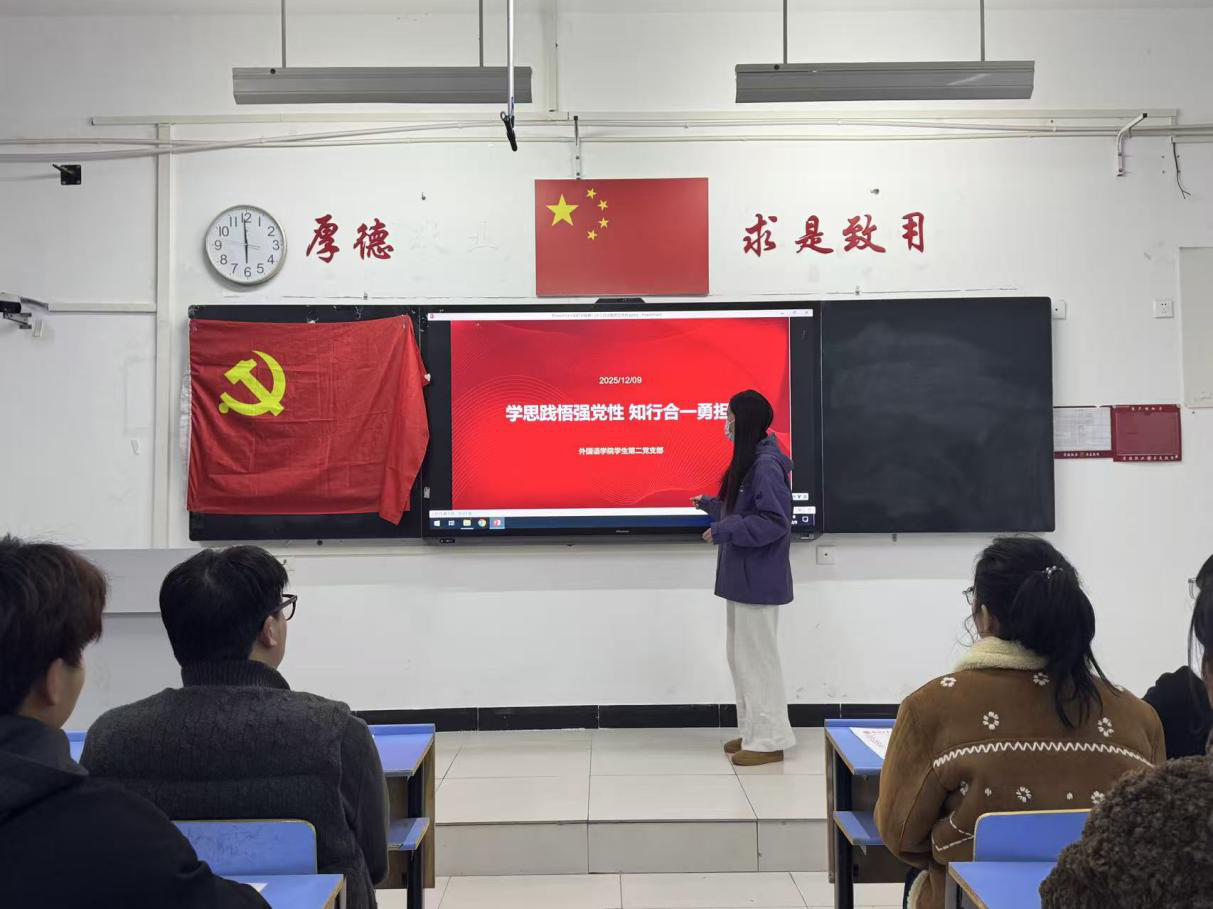 (文/李怡洁 图/钱旭)为推动党员将理论学习转化为党性修养,以知行合一的实际行动强化责任担当,外国语学院学生第二党支部于12月9日18:00在文华2-216教室开展以“学思践悟强党性 知行合一勇担当”为主题的党日活动。此次活动由组织委员花晨丽同志主持,支部全体党员参与本次活动。