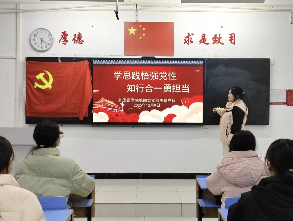 (文/周泓妤 图/何俊源)为持续深化党员理论武装,推动党性修养与实践担当深度融合,外国语学院第四党支部于12月9日19:00在文华2-216,组织开展了“学思践悟强党性 知行合一勇担当”主题党日活动,本次活动由组织委员苏玉晴同志主持,支部全体党员共同参加。