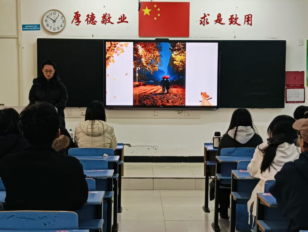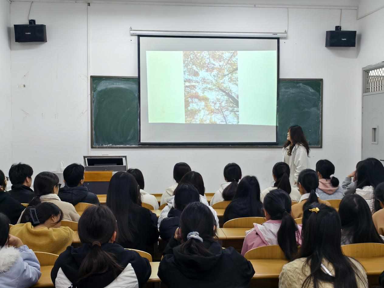 大赛现场,参赛选手站在台前依次介绍自己的作品。每一段讲述让照片有了鲜活的灵魂。一张张定格秋景的照片,搭配着真诚动人的讲述,让现场满是关于秋天的温柔与感动,一片落叶,一滴晨露,都是生活给予的小确幸,秋天中的剪影静谧而美好,让在场的同学们感受到了秋天的治愈力量。
