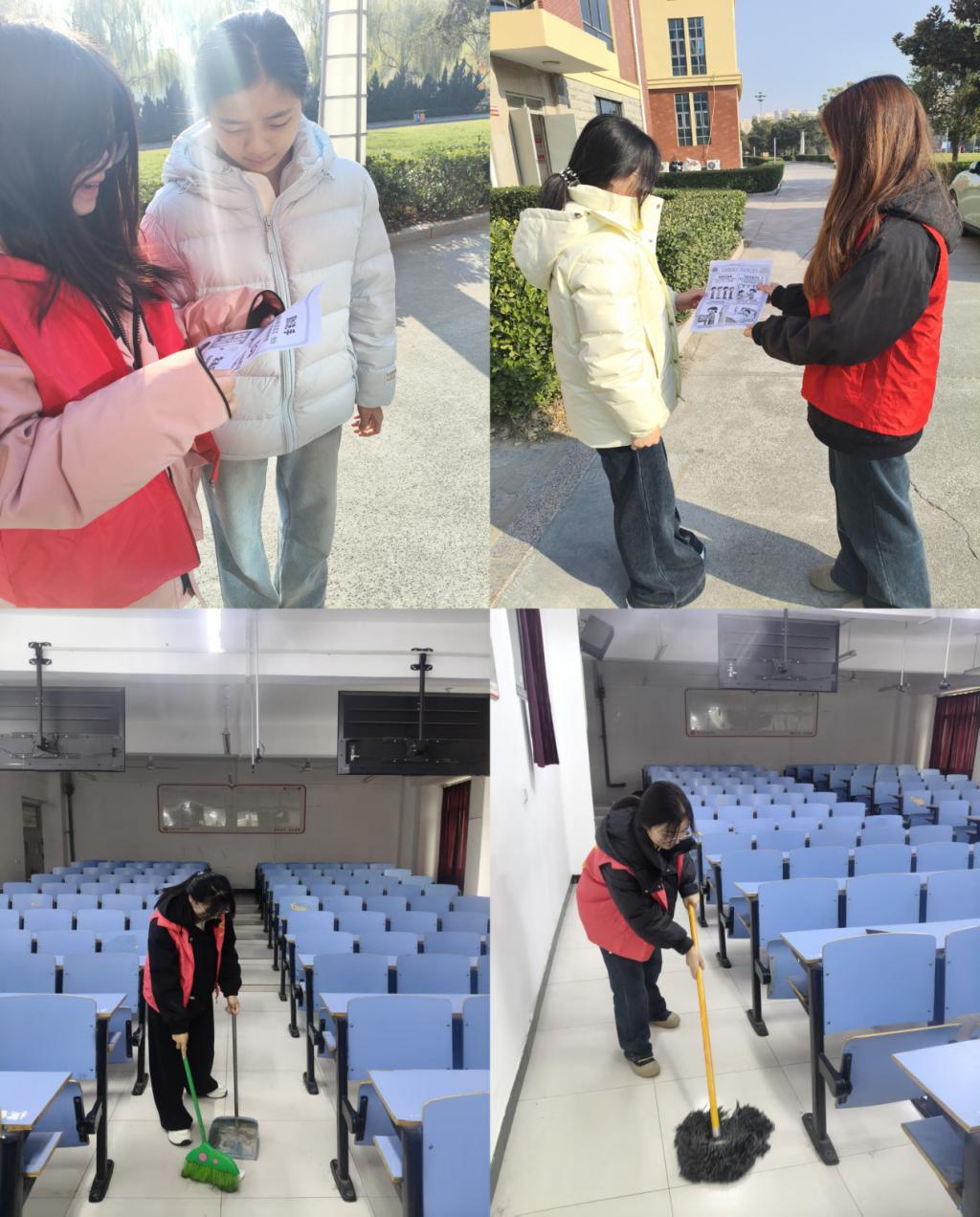 活动当天,志愿者们提前做好分工,手持清扫工具奔赴校园公共区域、教学楼教室等重点区域。大家发扬不怕脏、不怕累的精神,细致清理地面垃圾、对卫生死角进行集中整治,让校园环境焕然一新。在防疫宣传环节,志愿者们通过现场讲解等形式,向过往学生普及科学防疫知识,重点讲解口罩正确佩戴、日常消毒流程、社交距离保持等实用技巧,提醒大家关注自身健康,做好常态化防疫。此外,志愿者们还结合冬季传染病防控特点,分享了健康作息、饮食调理等相关知识,引导师生树立“健康第一”的理念,增强自我防护意识和能力。