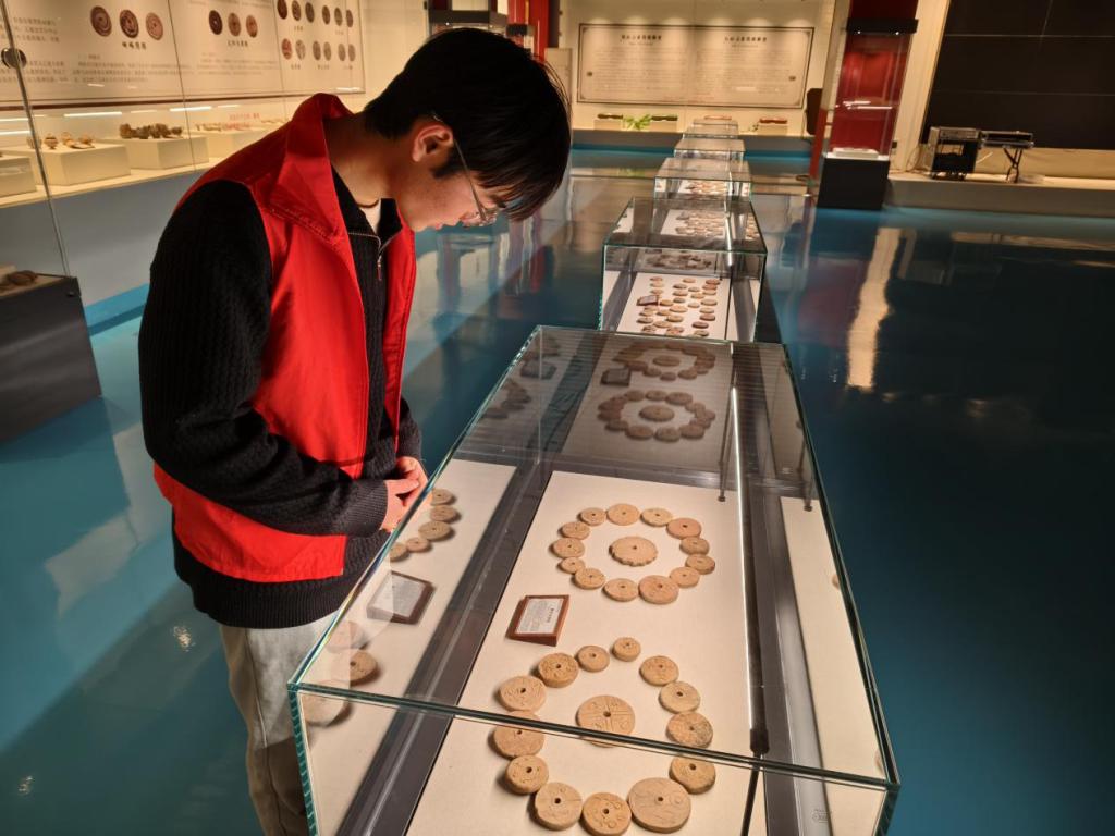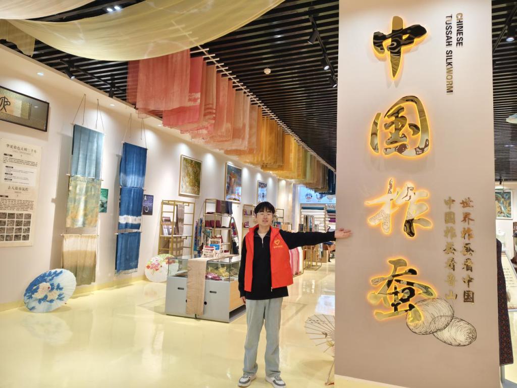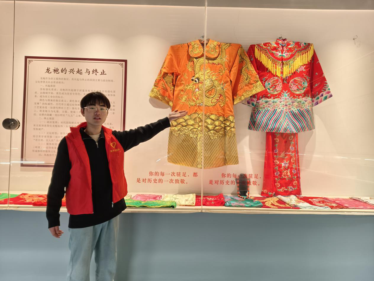 活动现场,郭昶昊同学身着红色志愿者马甲穿梭于各个展区。在“中国柞蚕”标识墙前,介绍鲁山柞蚕的行业地位;在五彩草木染布料展墙前,讲解古法染色技艺;在龙袍与嫁衣展柜旁,解读纹样背后的文化内涵。面对展柜里的新石器时代纺轮,他俯身凝视,将课本知识与实物历史相联结,让参观者直观感受柞蚕丝绸文化的千年积淀,也让他真切体会到用专业讲述文化的价值与乐趣。