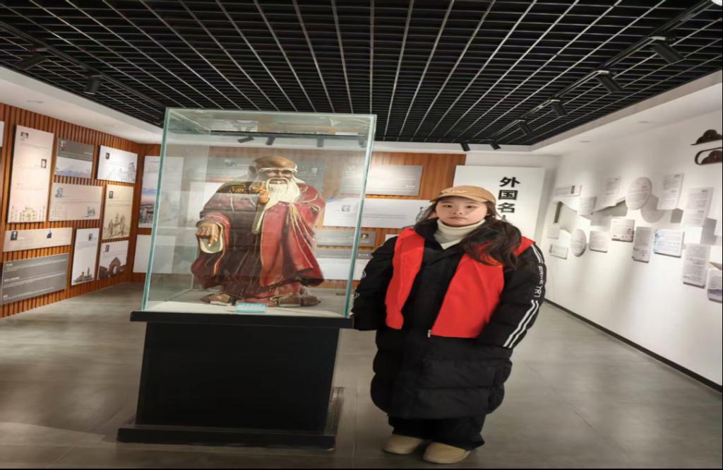 鹿邑县作为老子的诞生地,被誉为“道家之源、道教祖庭”,老子历史博物馆更是承载着厚重的道家文化底蕴,馆藏的丰富文物与《道德经》相关史料,是中华优秀传统文化的重要瑰宝。本次志愿服务中,潘怡源同学提前深耕馆内馆藏资料,结合英语专业优势,将老子“道法自然”“上善若水”等核心思想与博物馆展品背后的历史故事相融合,打磨出兼具专业性与通俗性的双语讲解稿。活动现场,她不仅为前来参观的中外游客提供英语讲解服务,细致解读文物背后的文化内涵与老子思想的时代价值,还耐心解答游客关于道家文化的相关问题,用流畅的英文搭建起中外文化交流的桥梁,让现场游客在沉浸式体验中感受中华传统文化的独特魅力。