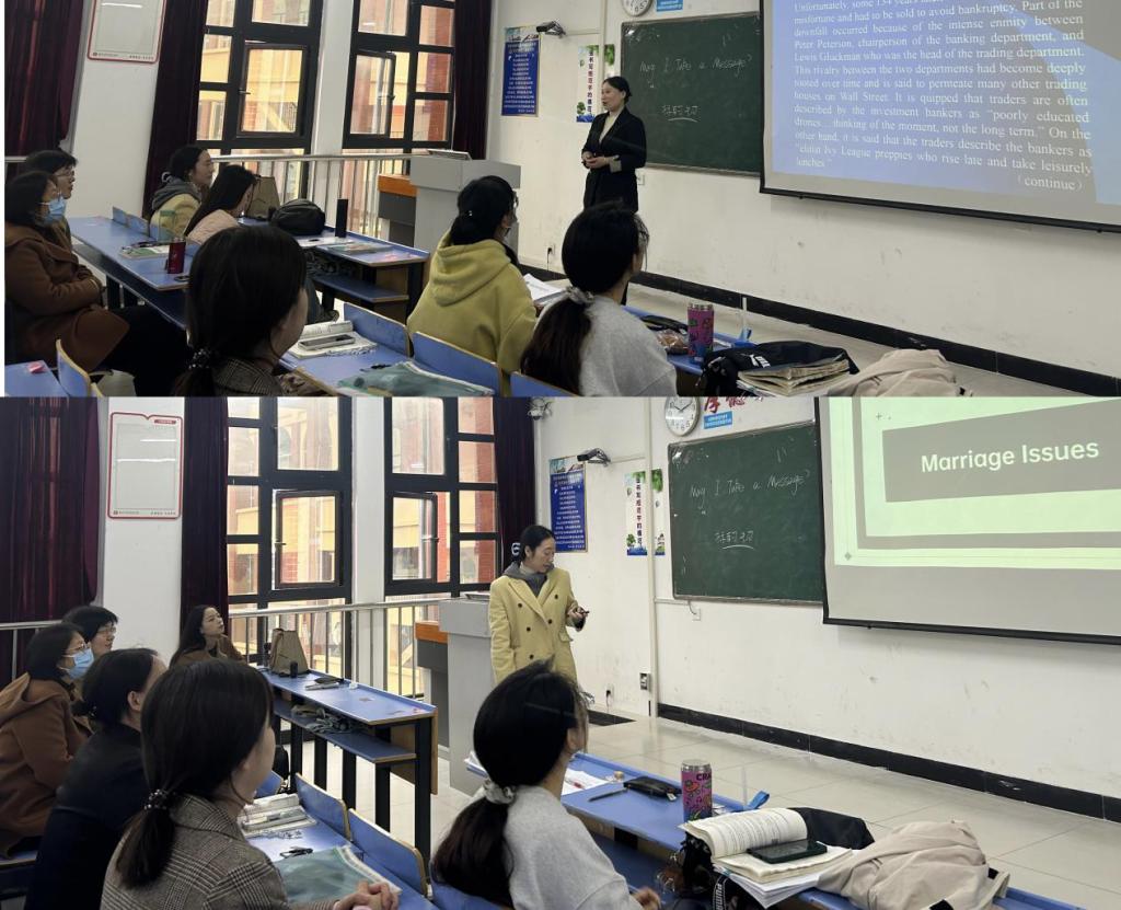 活动中,每位老师围绕所授课程的章节内容展开分享。如:纪昌菊老师以“中国高铁核心技术的获得”为案例,让学生在感叹中国高铁领先世界的同时,认识到在谈判过程中策略选择的重要性;屈景洋老师以教学主题为切入点,在归纳知识点、设定讨论、提问等环节的同时,引入与本节课主题相关的儒家传统美德,帮助学生树立正确的婚姻和家庭观;魏洁老师以学生学情为出发点,灵活调整教学方法、详尽讲述缩句技巧,让学生在面对长难句时能够理清思路,掌握方法。展示环节中,所有老师均准备充分,体现了在教学流程和设计方面的经验及独特见解。