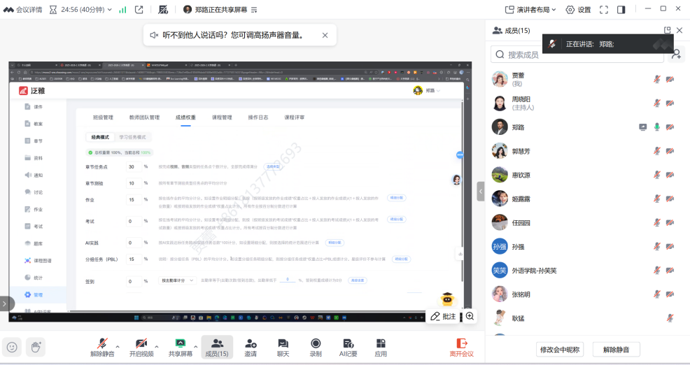 线上课程负责人郑路就学习通课程平台建设作专题说明,详细介绍了平台操作流程、功能模块及实际应用场景,帮助教师将线上资源有效融入课堂教学,推动数智化手段与教学深度融合,提升课堂互动与教学反馈的精准度。