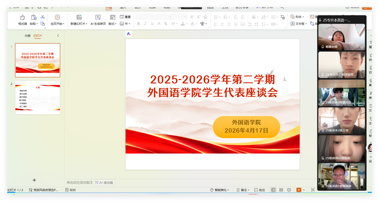 (图/文 杨璐)为深入了解教学现状、倾听师生心声,4月14日至17日,外国语学院集中组织召开了期中学生专题座谈会,学院院长孙丽娟带队参会,教学科研副院长张国昌、学院督导组、教师代表及各年级、各专业学生代表分批次参与,围绕课程教学、学习体验、能力发展等核心议题共商对策、共促提升。