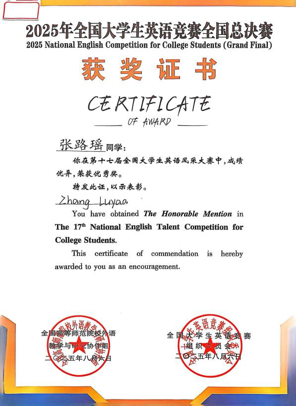 张路瑶,女,2023级英语(BK)4班。该生自入学以来,始终以饱满的热情和积极乐观的态度对待学习和生活,是老师的得力助手和同学们的好榜样。